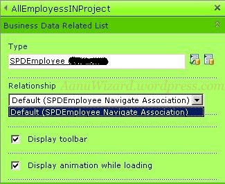 2) Next add Business Data Related List Webpart and edit its property. Choose related entity. Here I have chosen Employee entity. Here you need to configure the Association method. This entity should have association method.
