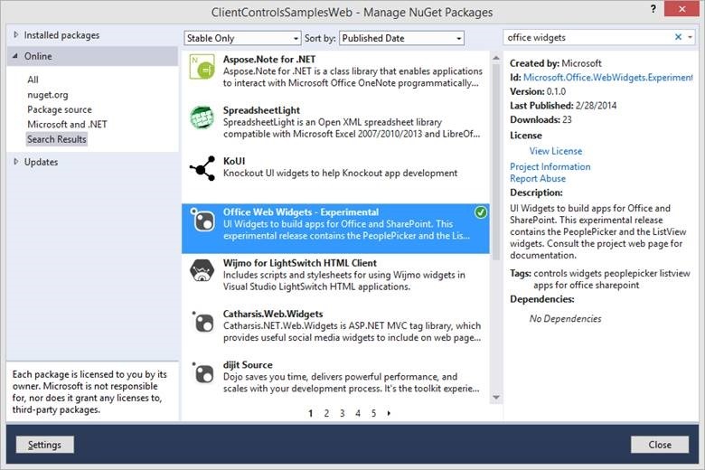 These experimental UI widgets were announced at SPC14 and are intended to help building apps for Office and SharePoint. The first release includes People Picker and the List View widgets. As per the Office dev team, these widgets are “experimental” and its primary goal is to collect feedback. They plan to release these controls for production use soon. Download it from NuGet Manager (search for Office Widgets) . Try it and send your feedback on UserVoice using the Office Web Widgets category.